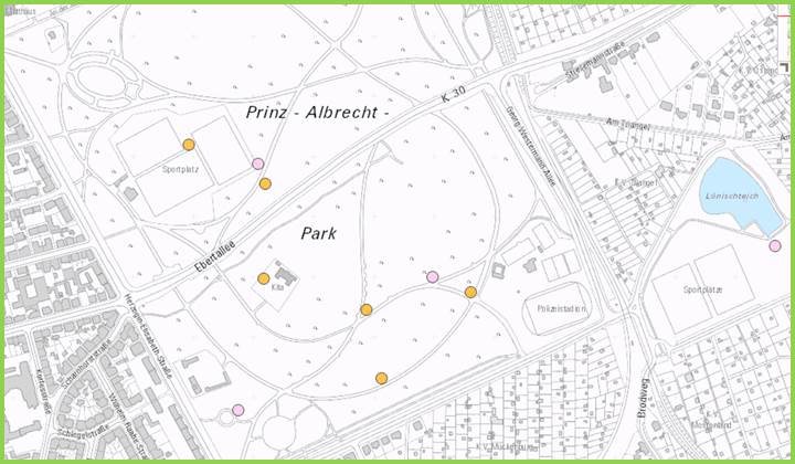 Bestätigte Befallsstellen Eichenprozessionsspinner im Prinz-Albrecht-Park; Rosa=2017, Orange=2018: