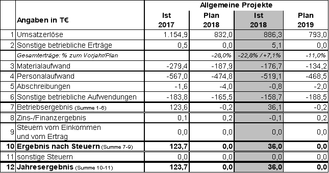 Im Bereich „Allgemeine Projekte“ wurde ein nicht geplanter Überschuss in Höhe von rd. 36,0 T€ erwirtschaftet.