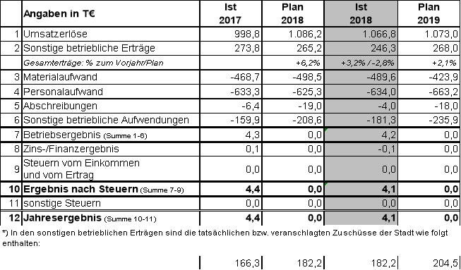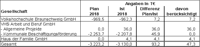 Die VHS schließt das Geschäftsjahr 2018 mit einem Fehlbetrag vor Verlustübernahme in Höhe von rd. 962,3 T€ ab. Das im Wirtschaftsplan 2018 vorgesehene Budget in Höhe von rd. 969,5 T€ wurde entsprechend um rd. 7,2 T€ unterschritten. Der Fehlbetrag wird gemäß der gesellschaftsvertraglichen Verpflichtung von der Stadt Braunschweig ausgeglichen.