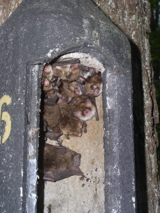 Kolonie der Fransenfledermaus in einer Nisthilfe