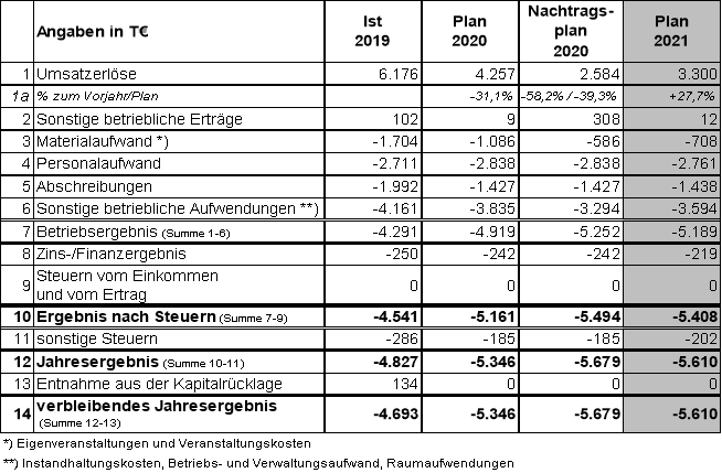 Die vorliegende Planung und mittelfristige Unternehmensvorschau berücksichtigt die geplante Sanierung der Stadthalle. Die Schließzeit ist planerisch ab dem zweiten Halbjahr 2021 berücksichtigt. Hierdurch reduzieren sich die Erträge im Jahr 2021 deutlich, in den Jahren 2022 bis 2024 sind keine Erträge geplant. Zudem sind durch den Fortbestand der Corona-Pandemie nur geringe Erträge berücksichtigt.