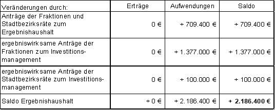 Die bisherige Beschlusslage zu von den Fraktionen gestellten Anträgen und zu den Vorschlägen der Stadtbezirksräte für die Investitionen führt in 2021 saldiert zu folgenden Veränderungen: