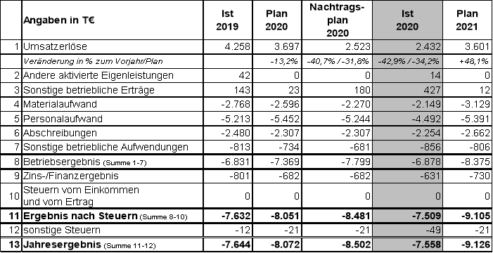 Gegenüber der Wirtschaftsplanung für das Jahr 2020 konnte eine Verbesserung um 514 T€ erzielt werden. Im Vergleich zur Nachtragswirtschaftsplanung 2020, die die erwarteten Corona-bedingten Auswirkungen von -430 T€ ausweist, ergibt sich eine Unterschreitung von 944 T€. Die Corona-Pandemie wirkt sich entgegen der Erwartungen insgesamt positiv auf das Jahresergebnis der Gesellschaft aus (+110 T€). Anderweitige Effekte führen zu weiteren Verbesserungen von 404 T€.