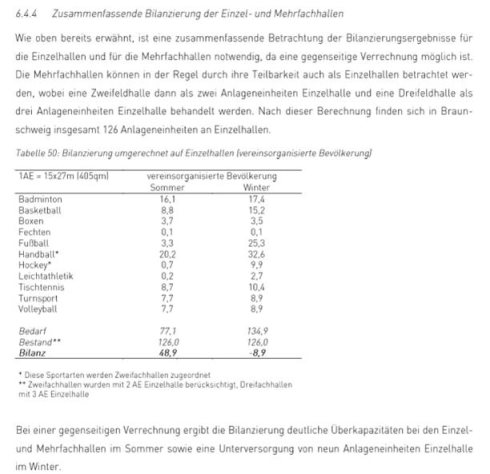 Im Januar 2014 hat das Institut für kooperative Planung und Sportentwicklung (ikps) im Rahmen des Grundlagenberichtes „Sport und Bewegung in Braunschweig; Grundlagen zur kommunalen Sportentwicklungsplanung auch eine Bilanzierung der Einzel- und Mehrfachhallen in Braunschweig vorgenommen.