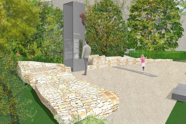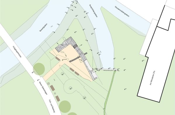 Im Winkel des historischen Mauerwerks ist für Gruppen bei Führungen eine kleine räumliche Aufweitung mit wassergebundener Decke geplant, die über einen Weg barrierefrei erreicht werden kann. Dort sollen Sitzmöglichkeiten geschaffen werden, die zum Teil auch mit Rückenlehnen versehen werden.