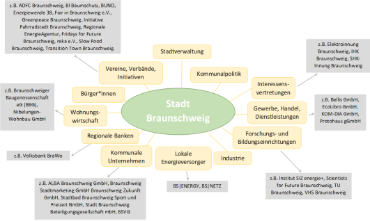 - Auf Seite 3 des Berichts zum IKSK 2.0 ist die Rede von „ersten Maßnahmenentwürfen“ und „externen Stakeholdern“. Die Grafik „Akteursgruppen im kommunalen Klimaschutz“ enthält lediglich die Themen aus den durchgeführten Workshops, aber keine Hinweise auf die Akteure selbst.