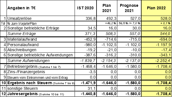 Der Erfolgsplan 2022 der Gesellschaft weist (vor Verlustübernahme durch die Stadt) einen