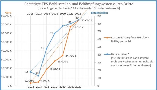 Mit der Zunahme der Befallsstellen geht eine Steigerung der jährlich aufzuwendenden Kosten einher, die durch die Vergabe der EPS-Bekämpfungsmaßnahmen an geeignete Dienstleister (i. d. R. Betriebe der Baumpflege und der Schädlingsbekämpfung) entsteht.