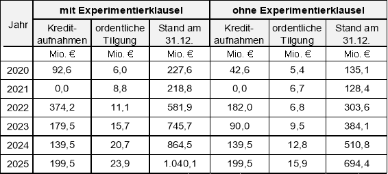 Die nachstehende Tabelle zeigt die Entwicklung der Kreditaufnahmen und der ordentlichen Tilgung. Hierbei sind auch die Tilgungsleistungen aus erfolgten und geplanten Kreditaufnahmen gemäß der Experimentierklausel berücksichtigt.