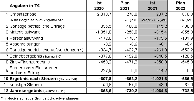 Die GGB schließt das Geschäftsjahr 2021 mit einem Fehlbetrag in Höhe von 1.064.626,29 € ab. Der Wirtschaftsplan 2021 sah einen Fehlbetrag in Höhe von 730.150,00 € vor. Somit ist gegenüber der Wirtschaftsplanung eine Ergebnisverschlechterung in Höhe von rd. 334 T€ zu verzeichnen.