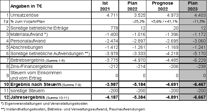 Die vorliegende Planung und mittelfristige Unternehmensvorschau berücksichtigt die geplante Sanierung und die damit einhergehende Schließung der Stadthalle nunmehr in den Jahren 2025 bis 2027. Entsprechend werden in diesem Zeitraum mit Ausnahme von monatlichen Erlösen eines Leasingfahrzeuges keine Erträge erwartet.