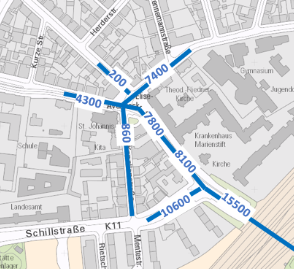 Auf Basis der Erhebung erfolgte eine Hochrechnung der Verkehrsbelastung auf 24 h. Insgesamt wurde eine Verkehrsbelastung auf der Leonhardstraße zwischen Elise-Averdieck-Platz und Kurze Straße in Fahrtrichtung Westen von rund 3000 Kfz/24 h ermittelt. Davon verteilen sich rund 500 Kfz/24 h in die Kurze Straße Richtung Norden und 2500 Kfz/24 h weiter auf die Leonhardstraße Richtung Westen. Am Knotenpunkt Leonhardstraße/St. Leonhard/Altewiekring verteilen sich die Verkehrsströme wie folgt (vgl. Abb. 3):