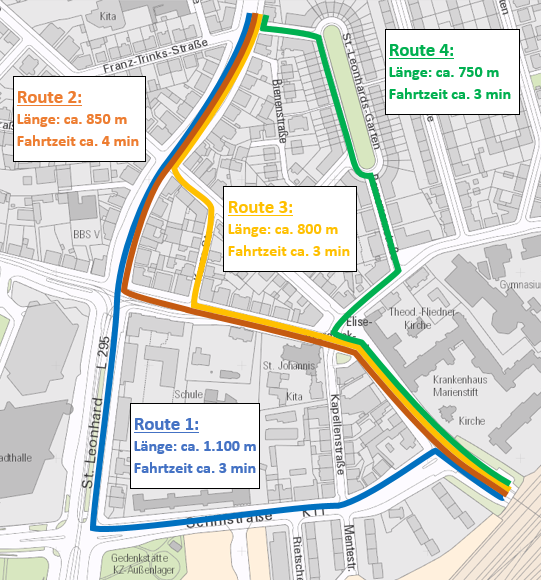 Nr. 60 wurden vier verschiedene Routen im Zeitraum der morgendlichen Spitzenstunden hinsichtlich Fahrzeit und Wegelänge verglichen, siehe Abb. 4. Dadurch ist ersichtlich, dass die Route 3 über die Kurze Straße und Helmstedter Straße sowohl von der Länge, als auch von der Fahrzeit gegenüber der Route 2 über die Leonhardstraße zum Altewiekring kürzer ist.