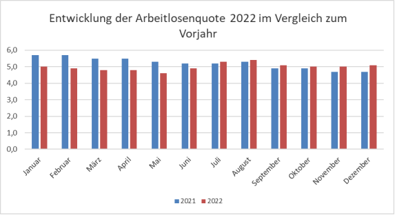 Im Jahresdurchschnitt ergibt sich ein leichter Rückgang der Arbeitslosenquote von 5,2% auf 5,0%. Im Vergleich zum Land Niedersachsen liegt die Stadt Braunschweig damit leicht unter dem Landeswert (2022: 5,3%).