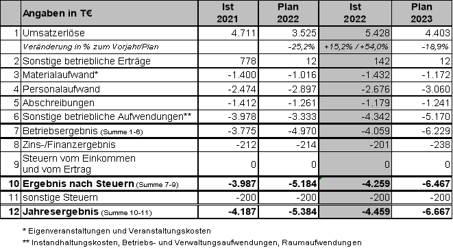 Bei Gesamterträgen in Höhe von 5.570 T€ (inkl. Zinserträgen) und Gesamtaufwendungen in Höhe von 10.029 T€ (inkl. Zinsaufwendungen und Steuern) erwirtschaftet die Gesellschaft im Geschäftsjahr 2022 einen Fehlbetrag in Höhe von 4.459 T€.