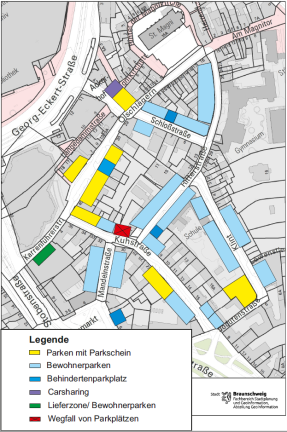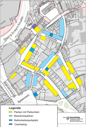 - Öffentliche Parkplätze (Parken mit Parkschein) wurden bei der Neuverteilung des ruhenden Verkehrs in räumlicher Nähe zu Gastronomie, Einzelhandel, Büros und Hotels konzentriert. Im Ölschlägern (südlich) werden sämtliche öffentliche Parkplätze beibehalten. Weitere öffentliche Parkplätze werden im Bereich der Kuhstraße berücksichtigt (z. B. für Büros und Hotels).