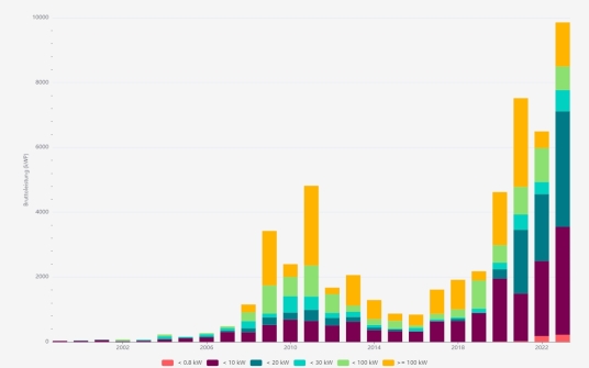 Abb 1.: In Betrieb genommene Photovoltaikleistung [kWp] in der Stadt Braunschweig 1999 bis Juli 2023 [der Zubau für das Gesamtjahr 2023 wird deutlich höher sein, als derzeit dargestellt]