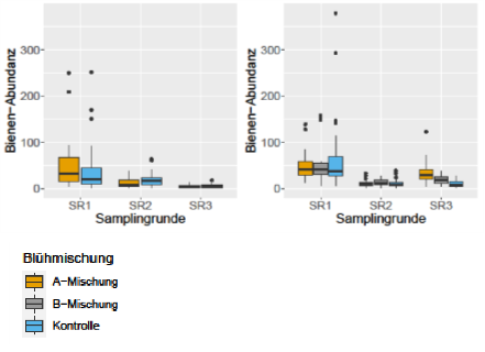 Vergleichsflächen (blau) mehr Bienen erfasst, als auf den Umsetzungsflächen (A-Mischung orange). Diese Beobachtung ist dadurch zu erklären, dass die mehrjährigen Pflanzen teilweise im ersten Standjahr noch nicht zur Blüte gelangen. Im zweiten Standjahr 2021 holen die Umsetzungsflächen auf und vor allem im August liegen sie deutlich vor den Vergleichsflächen. Analog zu der Blütendeckung konnten auf den Flächen der zweiten Saatgutmischung (B-Mischung grau) bereits im August 2021 mehr Wildbienen und auch mehr Arten nachgewiesen werden.
