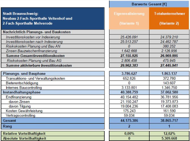 Die beiden genannten Beschaffungsvarianten wurden vergleichend gemäß bundeseinheitlicher Methodik für Wirtschaftlichkeitsuntersuchungen gegenübergestellt. Bei beiden Varianten bleibt das Eigentum bei der Stadt. Es wurde ein Leistungsspektrum von Planung, Bau, Bauzwischenfinanzierung und Gewährleistung über 10 Jahre betrachtet. Die Betriebsleistungen verbleiben in beiden Varianten bei der Stadt und werden daher als variantenunabhängig nicht betrachtet.