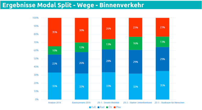- Im Binnenverkehr (Start und Ziel im Stadtgebiet) erreichen alle drei Zukunftsszenarien hohe Wegeanteile im Umweltverbund, der MIV-Anteil sinkt auf Anteile von 23-26% ab.