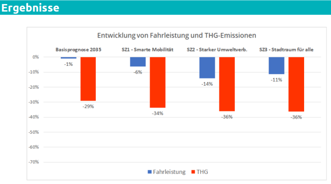- Bei der Verkehrsleistung zeigen sich weniger starke Effekte, da die modalen Verlagerungen eher auf den kurzen Wegen erfolgen (Fuß- und Radverkehr).