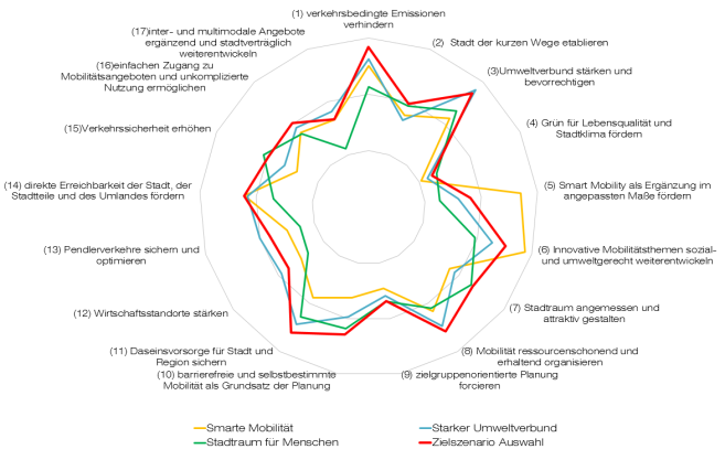 In der sogenannten Zielspinne ist die Wirkung auf die 17 strategischen Zielfelder des MEPs dargestellt (Ergebnis der qualitativen Bewertung). Der direkte Vergleich zwischen Ziel- und Zukunftsszenarien zeigt, dass vor allem Ähnlichkeiten mit dem Zukunftsszenario Starker Umweltverbund bestehen. (siehe Abbildung 3). Dies ist damit zu begründen, dass viele der gewählten Maßnahmen einen Fokus auf den Umweltverbund legen, da diese Maßnahmen das größte Potenzial zeigen, einen Modal Shift hervorzurufen und dadurch die THG-Werte nachhaltig zu reduzieren.