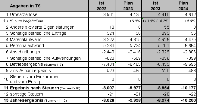 Bei Gesamterträgen in Höhe von 5.358 T€ (inkl. Zinserträgen) und Gesamtaufwendungen in Höhe von 14.332 T€ (inkl. Zinsaufwendungen und Steuern) erwirtschaftet die Gesellschaft im Geschäftsjahr 2023 einen Fehlbetrag in Höhe von 8.974 T€.