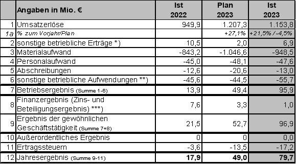 Der Jahresüberschuss betrug 79,7 Mio. € und lag damit 30,7 Mio. € über dem prognostizierten Ergebnis des Wirtschaftsplans. Diese Ergebnisverbesserung ist im Wesentlichen auf die gegenüber dem Vorjahr gefallenen Preise im Strom-, Gas- und Brennstoffbezug zurückzuführen. Ergebnisverbessernd wirken insbesondere die bereits frühzeitig auf entsprechend hohem Preisniveau durchgeführten Vermarktungen der produzierten Strommengen. Eine signifikante Verbesserung im Vergleich zum Wirtschaftsplan ergibt sich zudem aus der Ausnutzung von Marktpreisveränderungen im Rahmen der Spotoptimierung.