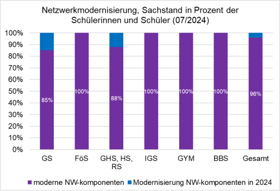 Für 96 Prozent der Schülerinnen und Schüler werden aktuell moderne Netzwerkkomponenten eingesetzt. Dieser Anteil soll zum Jahresende 2024 auf 100 Prozent gesteigert werden.