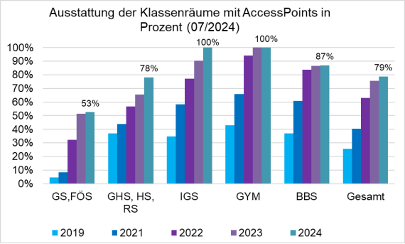 Die Entwicklung der Ausstattung der Unterrichtsräume mit Access-Points (kabelloses Datennetz) hat sich auf insgesamt 79 Prozent (Stand 07/2024) erhöht und wird bis Ende des Jahres auf 80 Prozent (Gesamtzahl) steigen.