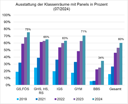 Aus dem nachstehenden Diagramm ist ersichtlich, dass mit Stand Juli 2024 ca. 60 Prozent aller unterrichtsrelevanten Räume mit digitalen Panels ausgestattet sind. Bis Ende des Jahres werden 62 Prozent der Unterrichtsräume über digitale Panels verfügen.