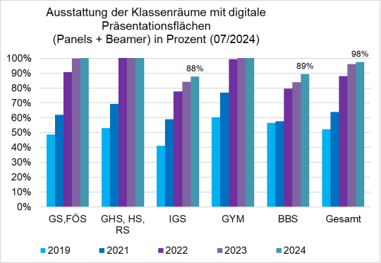 Werden Panels und Beamer zusammengezählt (siehe Abb. 5), zeigt sich, dass aktuell insgesamt 98 Prozent der Unterrichtsräume mit digitalen Präsentationsflächen ausgestattet sind.