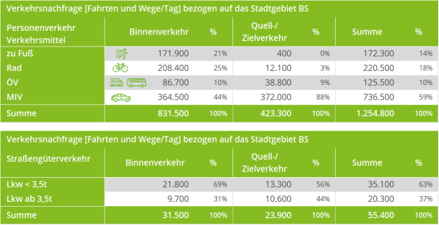 Ausgehend vom Analysefall 2016 entwickelt sich der Verkehr in Braunschweig aufgrund der oben erläuterten Entwicklungen und Einflussfaktoren. Die weiteren im Zielszenario enthaltenen Maßnahmen des MEP sind in dieser allgemeinen Verkehrsentwicklung noch nicht berücksichtigt. Nachfolgend sind die wesentlichen Ergebnisse der prognostizierten Verkehrsentwicklung bis 2035 im Vergleich zum Analysejahr 2016 zusammengefasst: