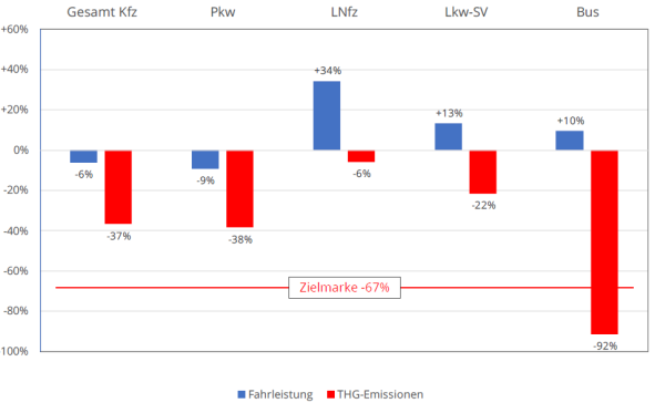 Aus der Stärkung des Umweltverbundes und dem Rückgang des verbrennungsintensiven MIV reduzieren sich die Treibhausgas-Emissionen (THG). Die THG-Emissionen werden als CO2-Äquivalente (CO2-äq) verstanden und enthalten neben Kohlenstoffdioxid (CO2) weitere THG-intensive Emissionen wie Methan oder Lachgas gemäß des Integrierten Klimaschutzkonzeptes 2.0 (IKSK 2.0). Die THG-Quote bezieht sich nach dem Territorialprinzip auf das Braunschweiger Stadtgebiet. Die Basis der THG-Emissionen stellen die Emissionsfaktoren des HBEFA 4.2 (Umweltbundesamt) unter der Verkehrsmodellierungssoftware VISUM dar und werden auf der Grundlage der Fahrleistungen im Kfz-Verkehr, getrennt für Fahrzeugklassen, berechnet.