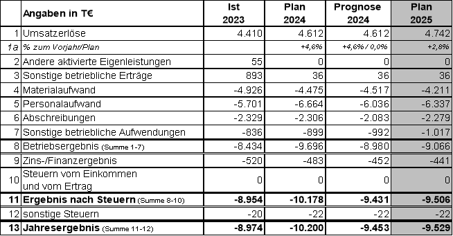 Im Vergleich zu den Daten der Jahre 2023 und 2024 stellen sich die Planzahlen wie folgt dar: