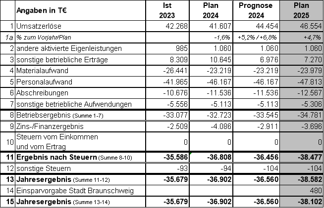 Der Wirtschaftsplan 2025 der BSVG weist einen Fehlbetrag in Höhe von 38.102 T€ aus. Der Verlust wird aufgrund des bestehenden Beherrschungs- und Gewinnabführungsvertrages von der BSBG ausgeglichen. Aufgrund der fortgeschriebenen Ergebnisentwicklungen und der Umsetzung von Einsparzielen ergibt sich gegenüber der bisherigen mittelfristigen Planung für das Jahr 2025 ein um 389 T€ geringerer Verlustausgleichsbedarf für die BSVG. Mit der Wirtschaftsplanung wird der angespannten Haushaltssituation der Stadt Braunschwieg Rechnung getragen.