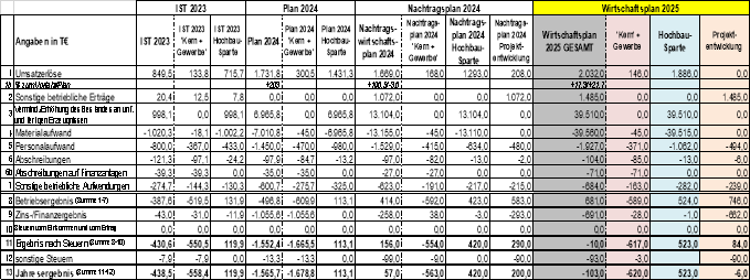 Wie schon im Nachtragswirtschaftsplan 2024 aufgeführt (siehe hierzu die Vorlage zur Sitzung des FPDA am 5. September 2024, DS 24-24265), beinhaltet der Wirtschaftsplan 2025 ebenfalls drei Unternehmensparten. Neben den Unternehmensbereichen ‚Kern und Gewerbe‘ und Hochbau (Sanierung Stadthalle) wird eine Sparte ‚Projektentwicklung‘ (Aufgabenbereich der Neuentwicklung der Burgpassage resp. zukünftig: „Stiftshöfe“) dargestellt.