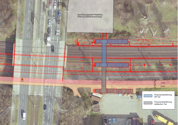 Da die DB keine Verpflichtung zur Realisierung einer zusätzlichen, zweiten Bahnsteigzuwegung im Süden durch Verlängerung der PÜ hat, liegt die alleinige Veranlassung bei der Stadt Braunschweig.