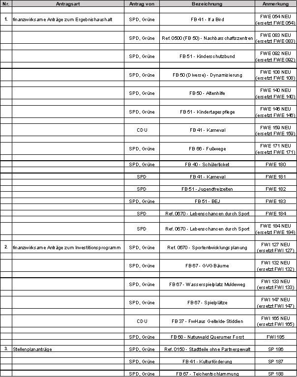 Außerdem wurden die Fraktionsanträge, welche bisher noch nicht in den Anlagen 4.1 und 5.1 der Hauptvorlage enthalten waren, in den entsprechenden Anlagen aufgenommen.