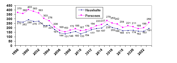 In den dezentralen Unterkünften ist – u.a. auch aufgrund der genannten Umstände – die Zahl der Personen (31.12.2019: 125 Personen; 31.12.2020: 150 Personen; 31.12.2021: 131 Personen; 31.12.2022: 139 Personen; 31.12.2023: 149 Personen) und Haushalte (31.12.2019: 78 Haushalte; 31.12.2020: 115 Haushalte; 31.12.2021: 108 Haushalte; 31.12.2022: 105 Haushalte; 31.12.2023: 119 Haushalte) noch immer erhöht. Leider war nicht jede dort untergebrachte Person aufgrund ihrer Persönlichkeitsstruktur in der Lage, in dieser Unterbringungsform Fuß zu fassen. Es kam vermehrt zu Beschwerden aus der Nachbarschaft und von Vermieterseite. Deshalb mussten einige Personen leider nach einiger Zeit in einer anderen Unterkunft untergebracht werden.