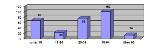 Im letzten Jahr wurden 169 männliche und 115 weibliche Personen in städtische Wohnungslosenunterkünfte eingewiesen. Die nachstehende Tabelle zeigt die Altersstruktur der insgesamt 284 Personen: