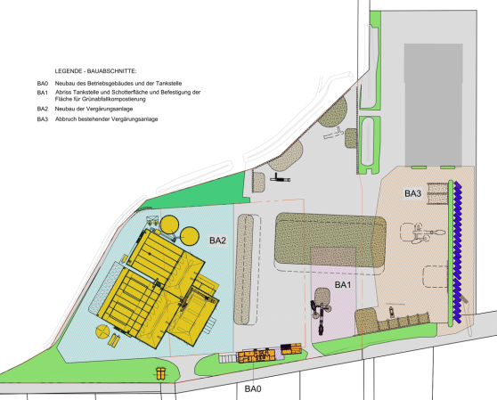 In einem letzten Bauabschnitt nach Fertigstellung der Vergärungsanlage und des Betriebsgebäudes wird der Rückbau der alten Vergärungsanlage durchgeführt (BA 3).