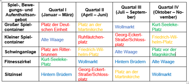 Überlegenswert wäre, dass - so weit wie möglich – jeweils ein Spiel-, Bewegungs- oder Aufenthaltsangebot pro Quartal und Cluster umgesetzt wird. Ein mögliches Aufstellungskonzept, abgestimmt auf den aktuellen Veranstaltungskalender ist in der untenstehenden Tabelle ersichtlich. Dieses Konzept wäre jährlich im Vorfeld mit dem Stadtmarketing abzustimmen und entsprechend anzupassen.