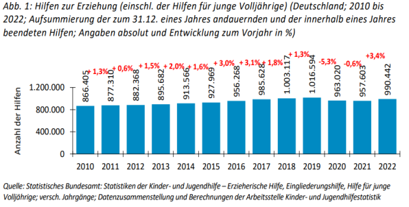 „Betrachtet man die Entwicklung der erzieherischen Hilfen ab 2010, so hat sich das Fallzahlenvolumen zwischen 2010 und 2022 um insgesamt rund 14 % erhöht. In diesem Zeitraum sind die Fallzahlen zunächst kontinuierlich bis 2019 gewachsen; im Jahr 2018 wurde sogar die Millionengrenze überschritten. Im Jahr 2020 – dem ersten Jahr der Coronapandemie – ging die Anzahl der erzieherischen Hilfen erstmals seit Beginn der Erfassung zurück. Mit einem nur leichten weiteren Rückgang blieben die Hilfezahlen 2021 nahezu konstant gegenüber dem Vorjahr. Im Jahr 2022 sind die Hilfen nun wieder deutlich gestiegen (vgl. Abb. 1). Das Plus von 3,4 % ist bislang der stärkste jährliche Anstieg im gesamten betrachteten Zeitraum. Die Höchststände der Jahre 2018 und 2019 wurden allerdings nicht erreicht“. [7]