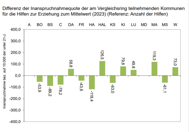 [8] Vgl. Dr. J. Pothmann, A. Tabel, Interkommunaler Vergleichsring Jugendhilfe mittlerer Großstädte zu den Hilfen zur Erziehung und angrenzenden Leistungs- und Maßnahmenbereichen, Kurz-Dokumentation Datenerhebung 2023, Stand vom 27.09.2024.