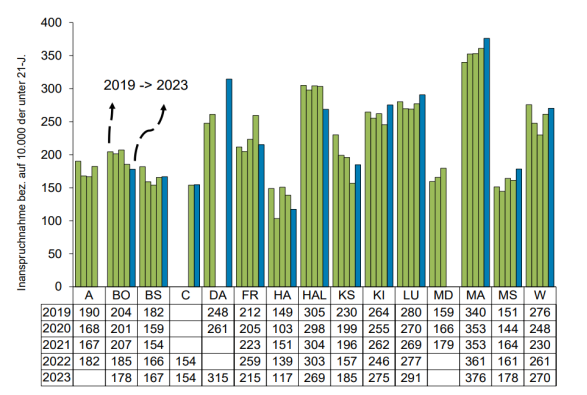 Insgesamt zeigt sich für Braunschweig mit Blick auf die gesamten Fallzahlen seit 2019 (mit Ausnahme von 2021/2022), ein rückläufiger Trend, wobei dieser Rückgang nur für den stationären Bereich zu beobachten ist, während die Inanspruchnahme bei den ambulanten Hilfen konstant ausfällt.[6]