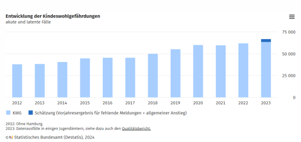„…bei mindestens 63 700 Kindern oder Jugendlichen eine Kindeswohlgefährdung durch Vernachlässigung, psychische, körperliche oder sexuelle Gewalt fest. Das waren rund 1 400 Fälle oder 2 % mehr als im Jahr zuvor. Da einige Jugendämter für das Jahr 2023 keine Daten melden konnten, ist aber sicher, dass der tatsächliche Anstieg noch deutlich höher ausfiel: Werden für die fehlenden Meldungen im Jahr 2023 die Ergebnisse aus dem Vorjahr hinzugeschätzt (+3 300 Fälle), liegt der Anstieg der Kindeswohlgefährdungen gegenüber dem Vorjahr bei 4 700 Fällen oder 7,6 %. Wird zusätzlich der allgemeine Anstieg berücksichtigt, erhöht sich das Plus sogar auf rund 5 000 Fälle beziehungsweise 8,0 %. Nach dieser Schätzung läge die Gesamtzahl im Jahr 2023 bei 67 300 Fällen. Neben Fehlern bei der Datenerfassung und dem Cyberangriff auf einen IT-Dienstleister wurde als Grund für die fehlenden Meldungen im Jahr 2023 auch die Überlastung des Personals im Jugendamt genannt“.[16]