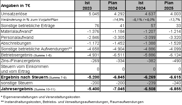 Bei Gesamterträgen in Höhe von 4.694 T€ und Gesamtaufwendungen in Höhe von 11.201 T€ (inkl. Zinsaufwendungen und Steuern) erwirtschaftet die Gesellschaft im Geschäftsjahr 2024 einen Fehlbetrag in Höhe von 6.508 T€.