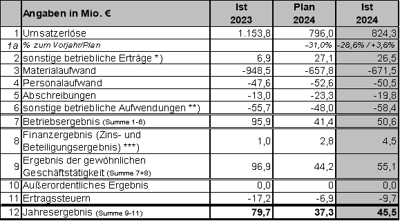 Der Jahresüberschuss betrug 45,5 Mio. € und lag damit 8,3 Mio. € über dem prognostizierten Ergebnis des Wirtschaftsplans. Diese Ergebnisverbesserung ist im Wesentlichen auf positive Vorjahreseffekte, insbesondere im Bereich der Mehr- und Mindermengen, die die negativen Auswirkungen (reduzierter Absatz an Gas- und Fernwärmekunden durch Wettereffekte und Verbrauchsreduzierungen) kompensierten, zurückzuführen. Ein weiterer Faktor, der das Jahresergebnis beeinflusst hat, war der Erhalt des Kohleersatzbonus in Höhe von 10,0 Mio. €, der im Rahmen der Umstellung der Erzeugungsanlagen gewährt wurde.