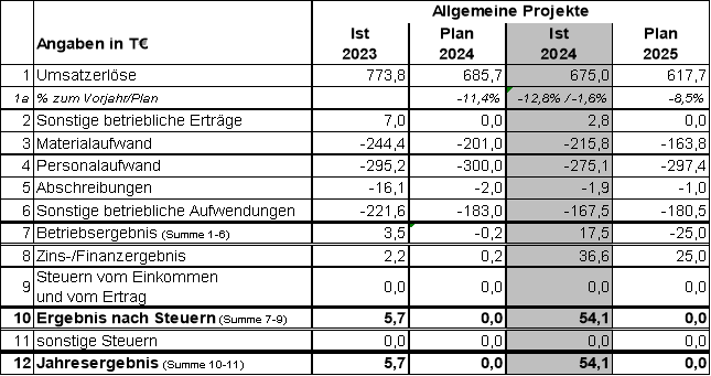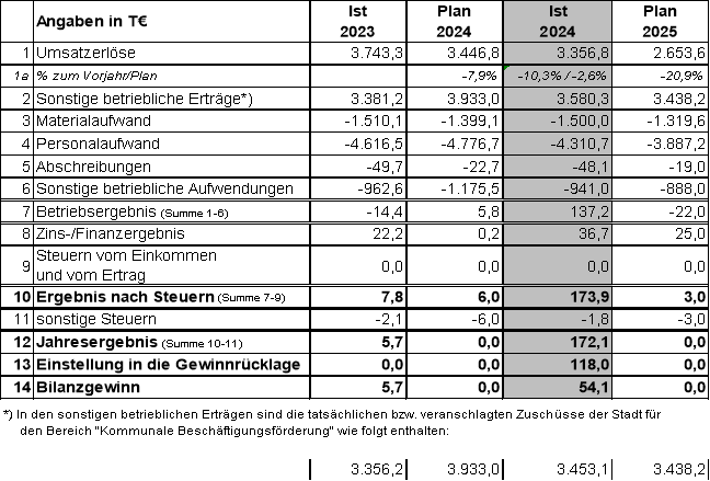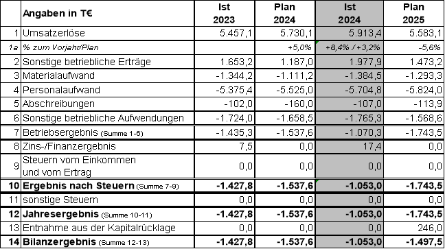 Die Umsatzerlöse konnten im Vergleich zu 2023 um 84 T€ gesteigert werden. U. a. sind dadurch bei den Material- und Personalkosten leichte Anstiege zu verzeichnen. Darüber hinaus konnten Zinserträge realisiert werden.